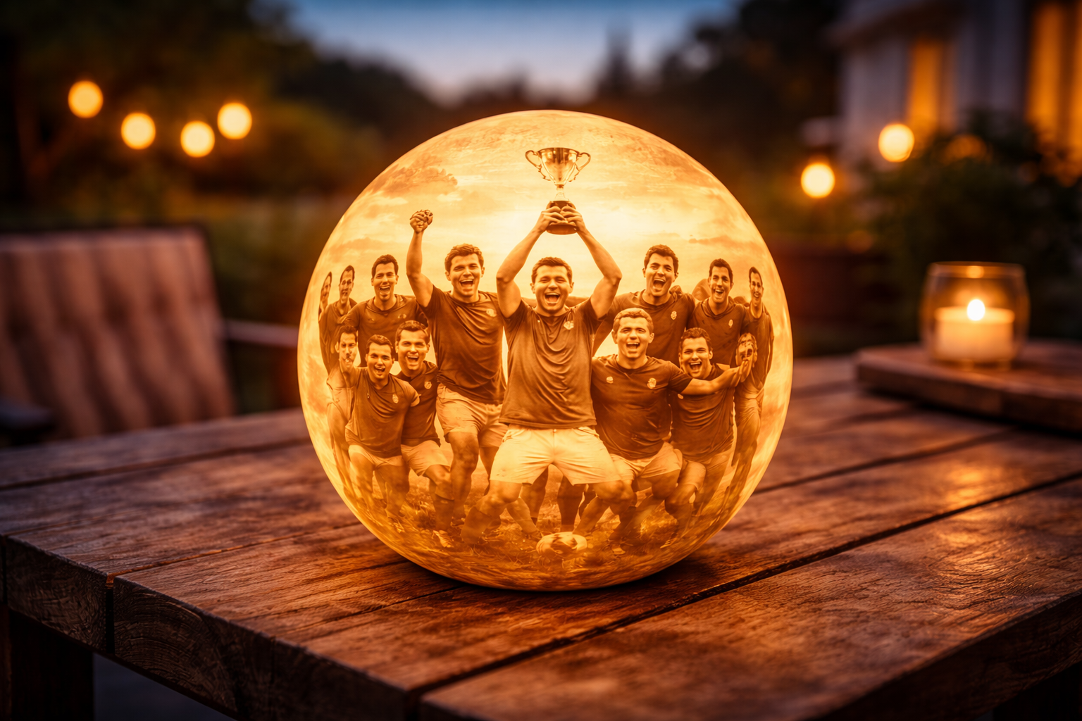 El resultado es una esfera luminosa personalizada que muestra tu imagen en 360°, con un acabado artístico y elegante.